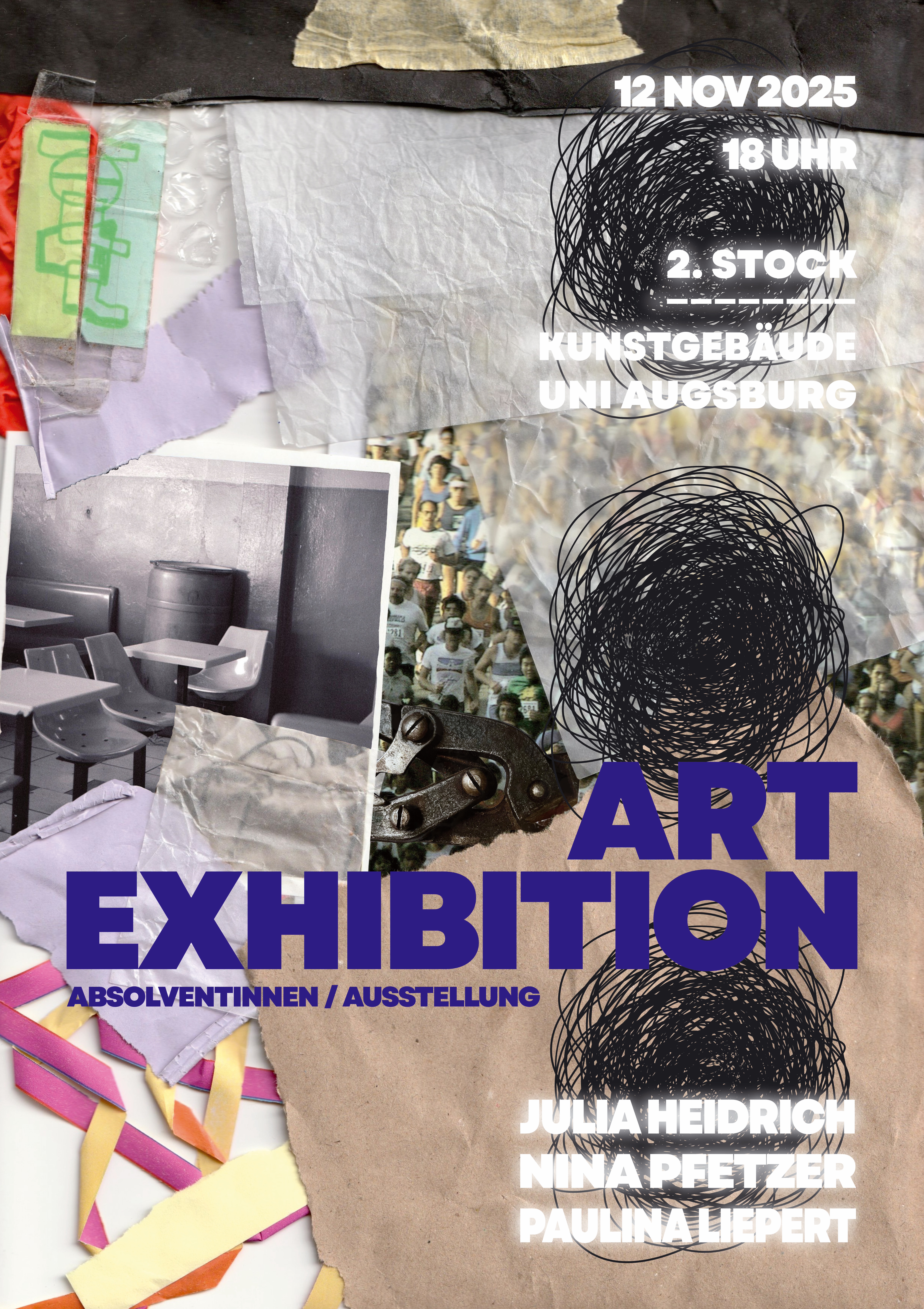 ? ?? ? ????????? ? ? ? ? ? ? ? Abschlussausstellung?der Absolvent:innen des Lehrstuhls Kunstp?dagogik ? ? ? ? Ausstellungsdauer: 12.11.2025 - 17.12.2025; Vernissage und Abschlussfeier: Mi., 12.11.2025, 18:00 Uhr ? ? ? ? Plakat zur Absolvent:innenausstellung ? ? ? ? ? Mensch sein - Mensch bleiben ? ? ? ??Ausstellung der Student:innen des Seminars Installation und Gro?plastik ? ? ? ? Ausstellungsdauer: 23.10.2025 - 15.11.2025; Vernissage: Mi., 22.10.2025, 18:00 Uhr, Finissage: So., 16.11.2025, 18:00 Uhr ????? ? Jüdisches Museum Augsburg / Ehemalige Synagoge ? ? ? ? ? ? ? ? ? Ausstellung der Student:innen?des Lehrstuhls Kunstp?dagogik ? ? ? ? Ausstellungsdauer: 28.01.2026 - 24.06.2026; Vernissage: Mi., 28.01.26, 18:00 Uhr ? ????? ? Den Flyer finden Sie hier ? ???????? ????? ? Bitte beachten Sie, dass eine Ausstellungsbesichtigung im Geb?ude G an Feiertagen und Wochenenden nicht m?glich ist.