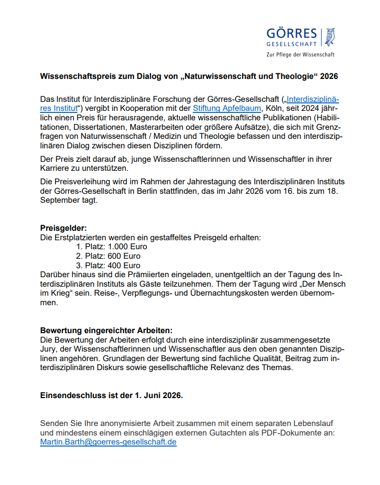 M?glichkeit zur Bewerbung für den Wissenschaftspreis zum Dialog von ?Naturwissenschaft und Theologie“ 2026