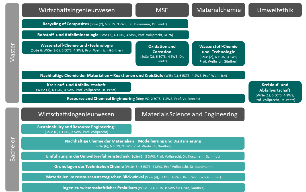 Der Lehrstuhl bietet Lehrveranstaltungen für die Studieng?nge Wirtschaftsingenieurwesen (WING), Materials Science, Materials Science and Engineering (MSE), Materialchemie sowie bei Interesse auch für Studierende umweltwissenschaftlicher Studieng?nge an. Die Anmeldung zu den Lehrveranstaltungen erfolgt über den Digicampus.