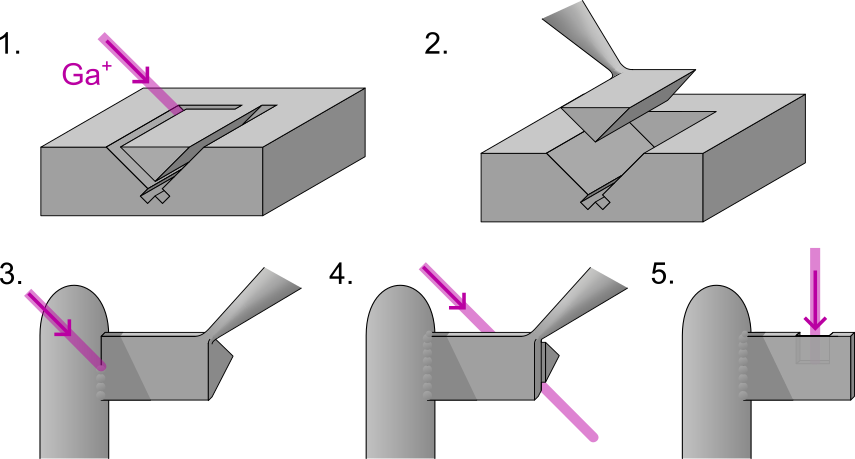 Mit einem fokussierten Ar-Ionenstrahl?wird ein kleiner Bereich aus der Probenoberfl?che "herausgeschnitten" und punktuell?an einen Halter/Manipulator geschwei?t. Nach dem Herausl?sen kann das herausgeschnittene Stück weiter bearbeitet werden, so dass je nach Bedarf eine Cross-Section- oder eine Plane-View-Lamelle entsteht. Dabei wird die Lamelle an einem Lamellenhalter befestigt und weiter gedünnt, bis die gewünschte Dicke erreicht ist. Da bei diesem Prozess gro?e Mengen an geladenen Teilchen auf der Probe einschlagen, muss die zu bearbeitende Probe elektrisch leitend sein.