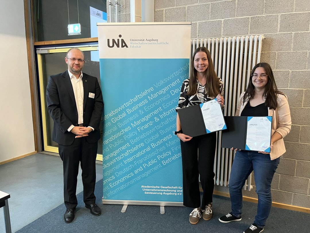 v.l.n.r.: Prof. Dr. Robert Ullmann (Lehrstuhl für Betriebswirtschaftliche Steuerlehre), Muriel Rey (Preistr?gerin), Katharina B?ck (Preistr?gerin), Jonas Kleinschroth (Preistr?ger, nicht anwesend) ? Universit?t Augsburg