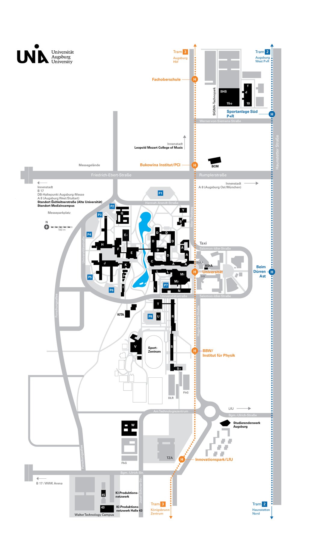 Arriving at the main station of Augsburg, you take the tram line 3 in the direction ?Haunstetten West“ until the stop. ?Universit?t“.