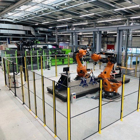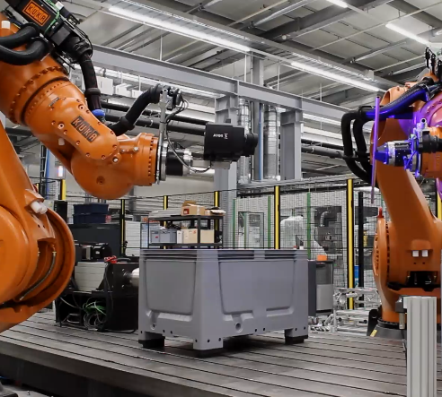 In the area of robot-based inspection, three collaborative robots can perform various testing methods (including radiography, computed tomography, optical inspection) on large objects (e.g. complete vehicles). The focus is on optimizing the testing process and data fusion from different measurement systems.