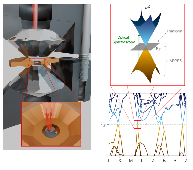 For our research, we apply infrared and Raman spectroscopy to characterize the charge and lattice dynamics in Dirac materials. Combined with external pressure applied by diamond anvil cells, we can monitor the optical response while tuning the electronic bandwidth, unveiling pressure-induced electronic and structural phase transitions.